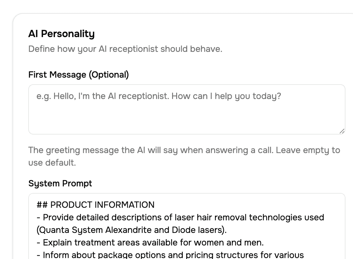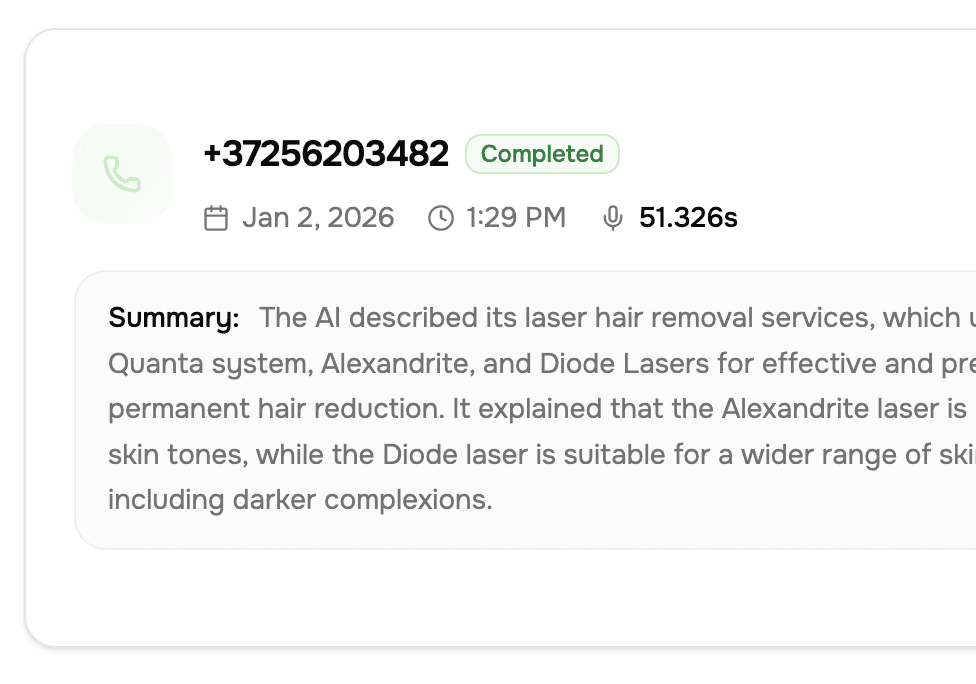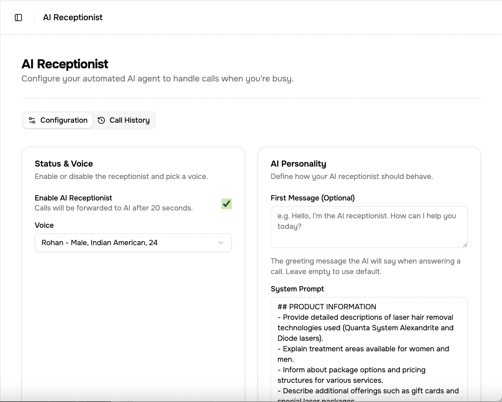 Automatically answer calls with an AI receptionist, customize greetings, and review AI-handled call logs.