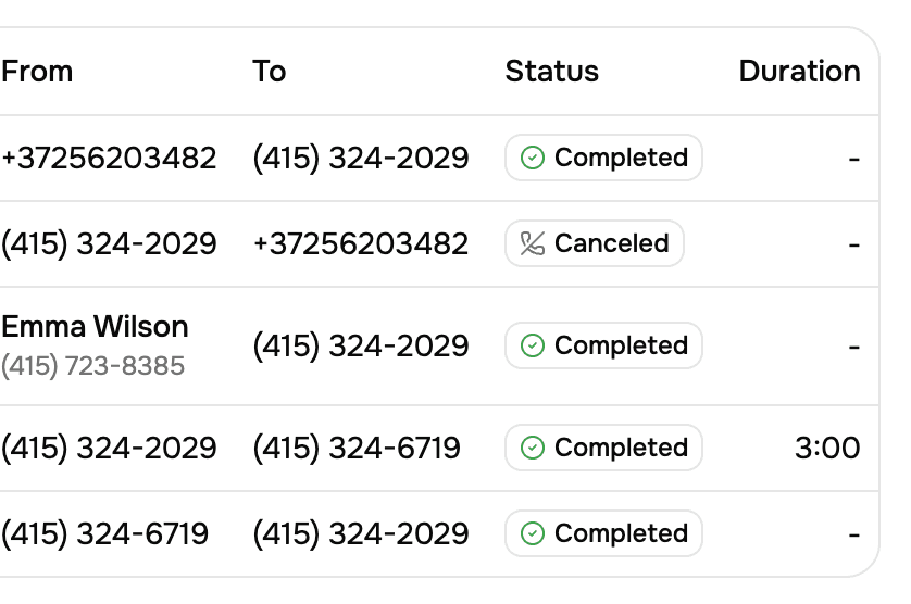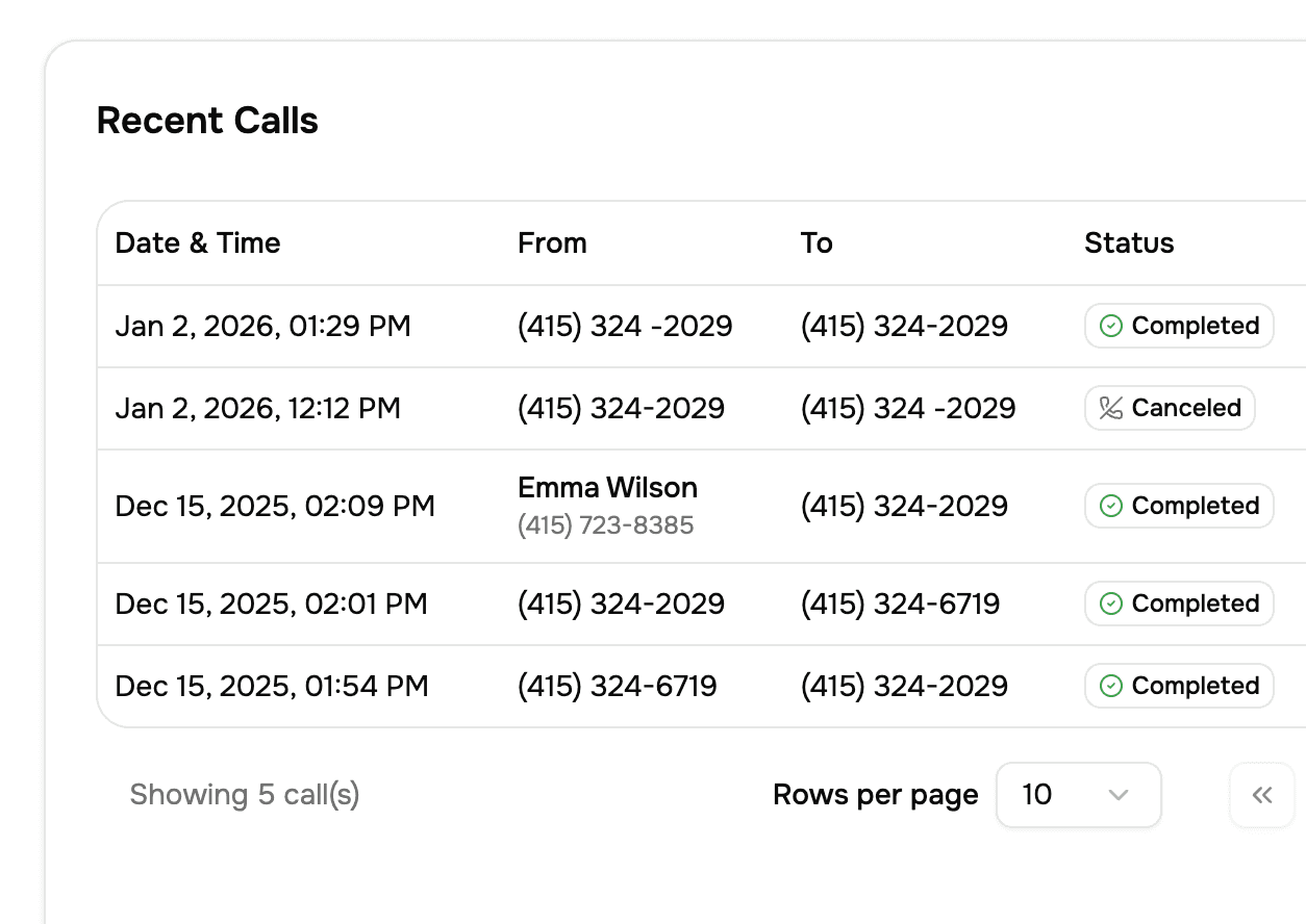 See live call status, recent inbound and outbound calls, durations, and completion states as they happen.