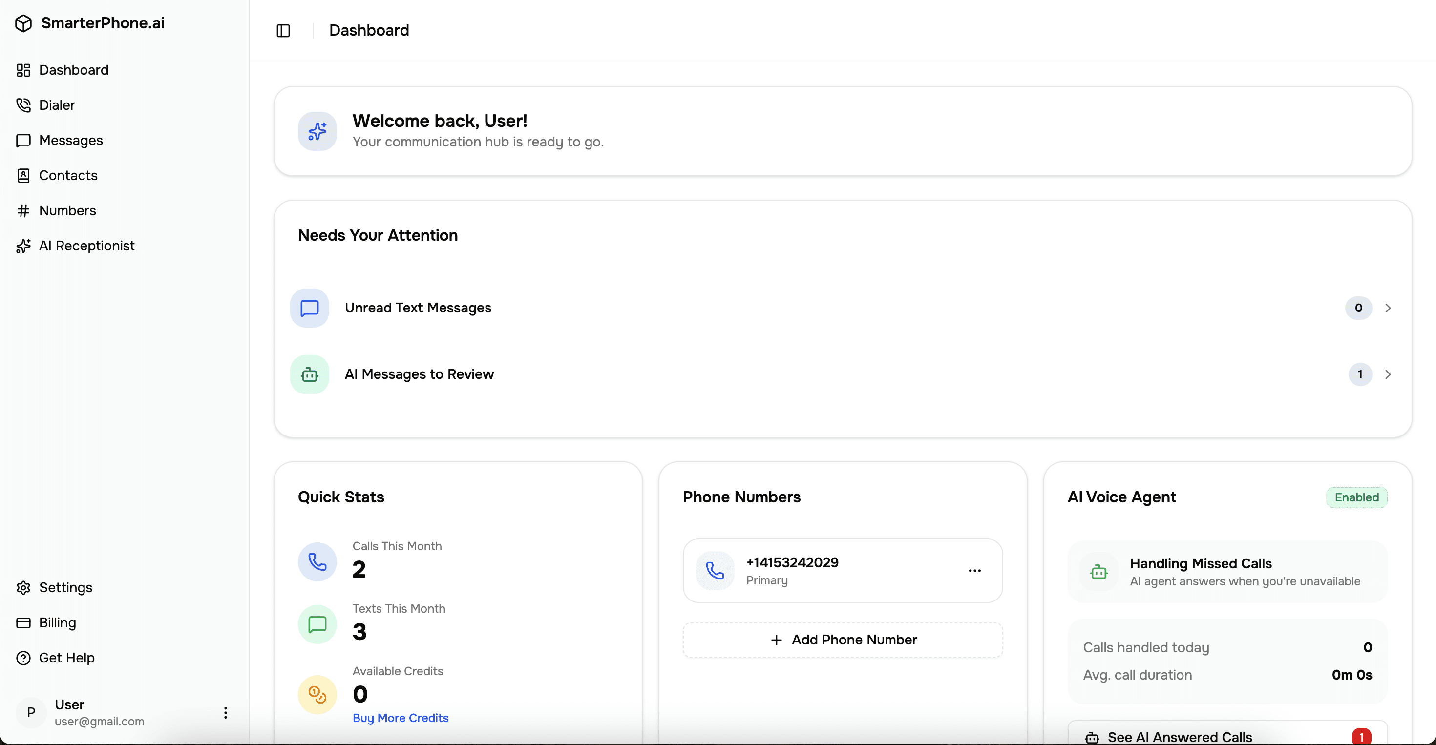 Call, text, and manage conversations from one dashboard — with an AI receptionist that never misses a call.